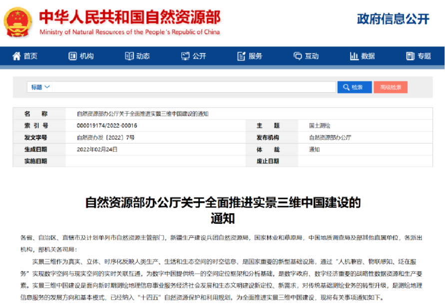 2022年2月24日,自然資源部辦公廳印發(fā)了《關(guān)于全面推進(jìn)實(shí)景三維中國(guó)建設(shè)的通知》?!锻ㄖ分赋觯?a href='http://m.arab-geologist.com/article/1129.html' target='_blank' title='實(shí)景三維'>實(shí)景三維作為真實(shí)、立體、時(shí)序化反映人類生產(chǎn)、生活和生態(tài)空間的時(shí)空信息,是國(guó)家重要的新型基礎(chǔ)設(shè)施,是數(shù)字政府、數(shù)字經(jīng)濟(jì)重要的戰(zhàn)略性數(shù)據(jù)資源和生產(chǎn)要素。實(shí)景三維中國(guó)建設(shè)是面向新時(shí)期測(cè)繪地理信息事業(yè)服務(wù)經(jīng)濟(jì)社會(huì)發(fā)展和生態(tài)文明建設(shè)新定位、新需求,對(duì)傳統(tǒng)基礎(chǔ)測(cè)繪業(yè)務(wù)的轉(zhuǎn)型升級(jí),是測(cè)繪地理信息服務(wù)的發(fā)展方向和基本模式,已經(jīng)納入“十四五”自然資源保護(hù)和利用規(guī)劃。