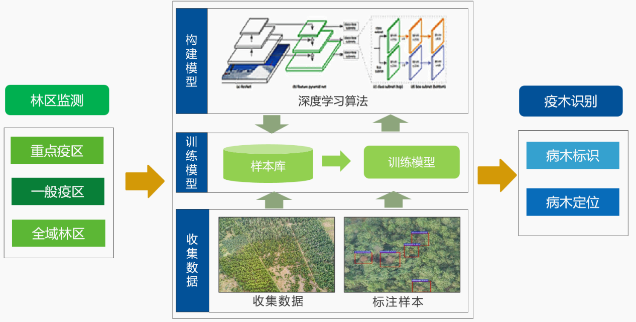 利用無人機(jī)、大飛機(jī)等監(jiān)測(cè)平臺(tái)采集林區(qū)數(shù)據(jù),依托自主研發(fā)識(shí)別AI算法,構(gòu)建人工智能數(shù)據(jù)樣本庫,覆蓋多時(shí)期、多樹種多脅迫等樣本數(shù)據(jù),以支撐高性能算法模型的訓(xùn)練和識(shí)別。