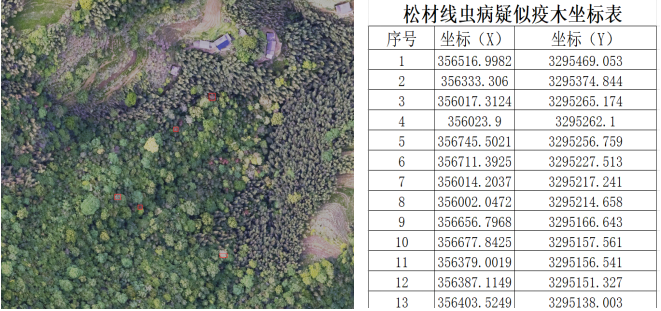 3.成果導(dǎo)出,AI松材線蟲病識(shí)別完成后生成帶標(biāo)識(shí)成果圖和疑似疫木坐標(biāo)表。