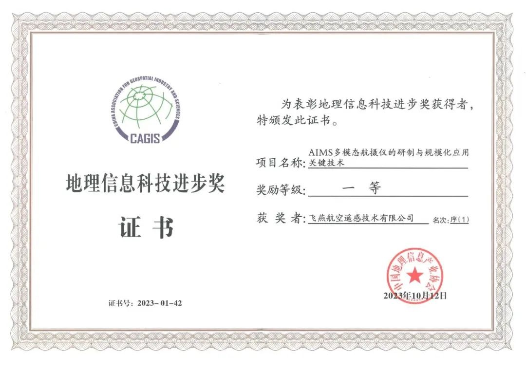 飛燕遙感打造了“AIMS多模態(tài)航空遙感一站式解決方案”。2022年入選《2022年度湖北省創(chuàng)新產(chǎn)品應(yīng)用示范推薦目錄》,2023年憑借《AIMS多模態(tài)航攝儀的研制與規(guī)模化應(yīng)用關(guān)鍵技術(shù)》獲得了由湖北省科技廳頒發(fā)的湖北省科學(xué)技術(shù)進步獎,由中國地理信息產(chǎn)業(yè)協(xié)會頒發(fā)的2023地理信息科技進步獎一等獎。