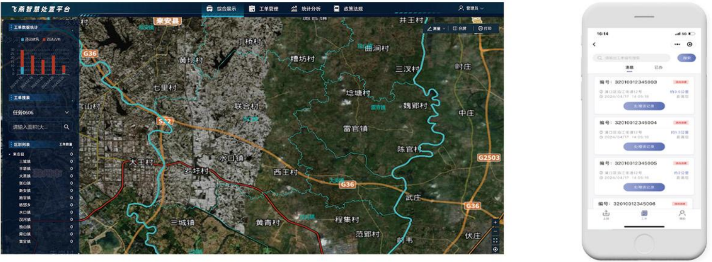 具備PC端和移動(dòng)端,面向市級(jí)、區(qū)級(jí)、街鎮(zhèn)級(jí)三級(jí)執(zhí)法部門用戶,提供違法線索派單、處置、反饋等功能,形成線索工單處理閉環(huán)。