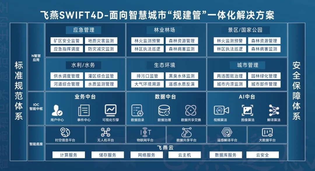 基于更高效規(guī)劃、建設(shè)新型智慧城市的目標(biāo),飛燕遙感自主研發(fā)無人機與無人機機庫,按照“一個低空感知網(wǎng)、一個多模態(tài)數(shù)據(jù)中心、1套監(jiān)測平臺、N個場景應(yīng)用”的思路研發(fā)了SWIFT4D產(chǎn)品體系,在飛燕基礎(chǔ)算力基礎(chǔ)上提供“天空地網(wǎng)”立體化、智能化服務(wù)。匯聚地理空間數(shù)據(jù)、物聯(lián)感知數(shù)據(jù)、管理業(yè)務(wù)數(shù)據(jù)等多源數(shù)據(jù),建設(shè)時空信息基礎(chǔ)平臺、低空監(jiān)測平臺、遙感解譯平臺、AI智能識別的智能底座,實現(xiàn)對城市的全面感知、智能分析、精準(zhǔn)研判、協(xié)同指揮和應(yīng)急處置,助力城市可持續(xù)發(fā)展。