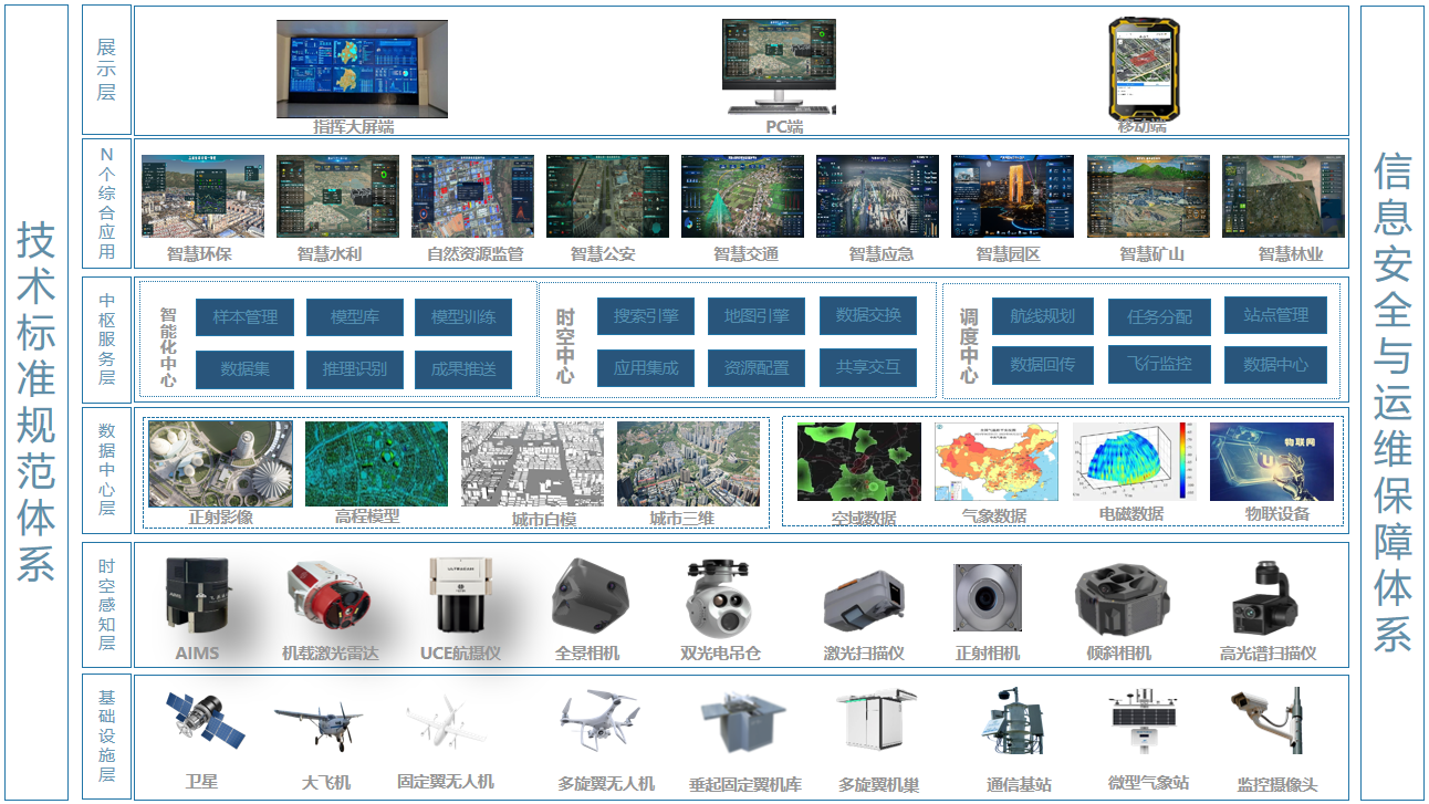 在遙感數(shù)據(jù)獲取方面,針對中高空、低空遙感分別自主研發(fā)了AIMS多模態(tài)航攝儀與“遠(yuǎn)瞰”低空無人值守系統(tǒng)。在一次性獲取所有主流航空遙感數(shù)據(jù)的基礎(chǔ)上,實現(xiàn)無人機自動巡檢、自動充電、異地部署、遠(yuǎn)程規(guī)劃指揮、數(shù)據(jù)自動回傳等功能,滿足城市區(qū)劃范圍內(nèi)山水林田湖草沙全場景作業(yè)需求。