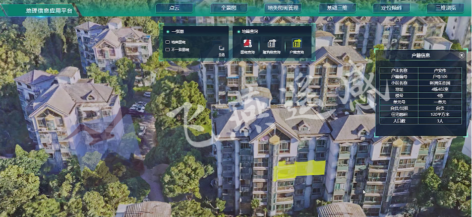 通過(guò)建筑物關(guān)鍵詞定位到建筑物位置并可以顯示建筑物屬性信息,在瀏覽屬性信息的同時(shí)可以多維度全方位觀察建筑物情況和周邊環(huán)境。