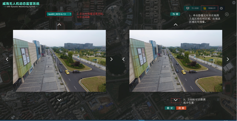 導(dǎo)入后的航片會在地圖上顯示。選擇相應(yīng)的比對與待比對航片,可以對同地區(qū)不同時段航片作比較,以發(fā)現(xiàn)地區(qū)地物變化情況,框選出地物差異點(diǎn),并編輯描述信息,可保存在系統(tǒng)后臺。