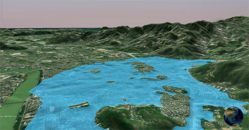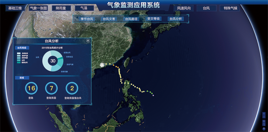 通過三維GIS技術(shù),結(jié)合氣象部門發(fā)布的氣象數(shù)據(jù)、現(xiàn)有的區(qū)域內(nèi)地形、河網(wǎng)等水文信息,構(gòu)建水利氣象監(jiān)測系統(tǒng)?;跉庀笠蛩貏討B(tài)分析,科學(xué)預(yù)測區(qū)域內(nèi)水域、水利造成的影響范圍及影響程度。針對極端天氣,例如臺風(fēng),系統(tǒng)會錄入臺風(fēng)的運(yùn)動軌跡與時(shí)間信息,預(yù)測臺風(fēng)登陸的時(shí)間地點(diǎn),適時(shí)發(fā)出預(yù)警信息。
