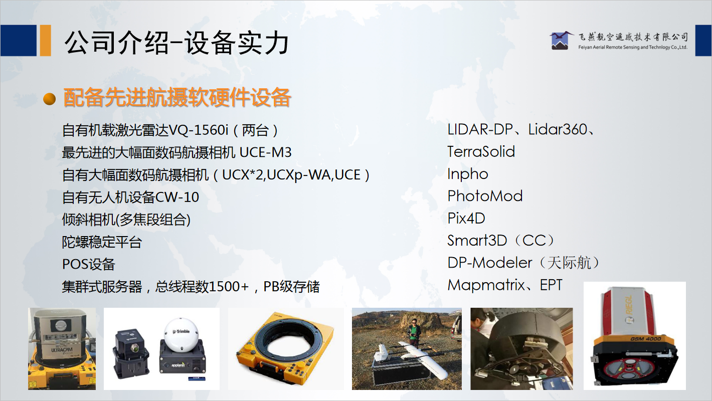 飛燕遙感配備兩臺機載激光雷達VQ-1560i、一臺5億像素傾斜攝影相機、五臺大幅面高精度UC系列數(shù)碼航攝儀、多種無人機及輔助設(shè)備,是全國航攝設(shè)備裝備最頂尖的企業(yè)之一。