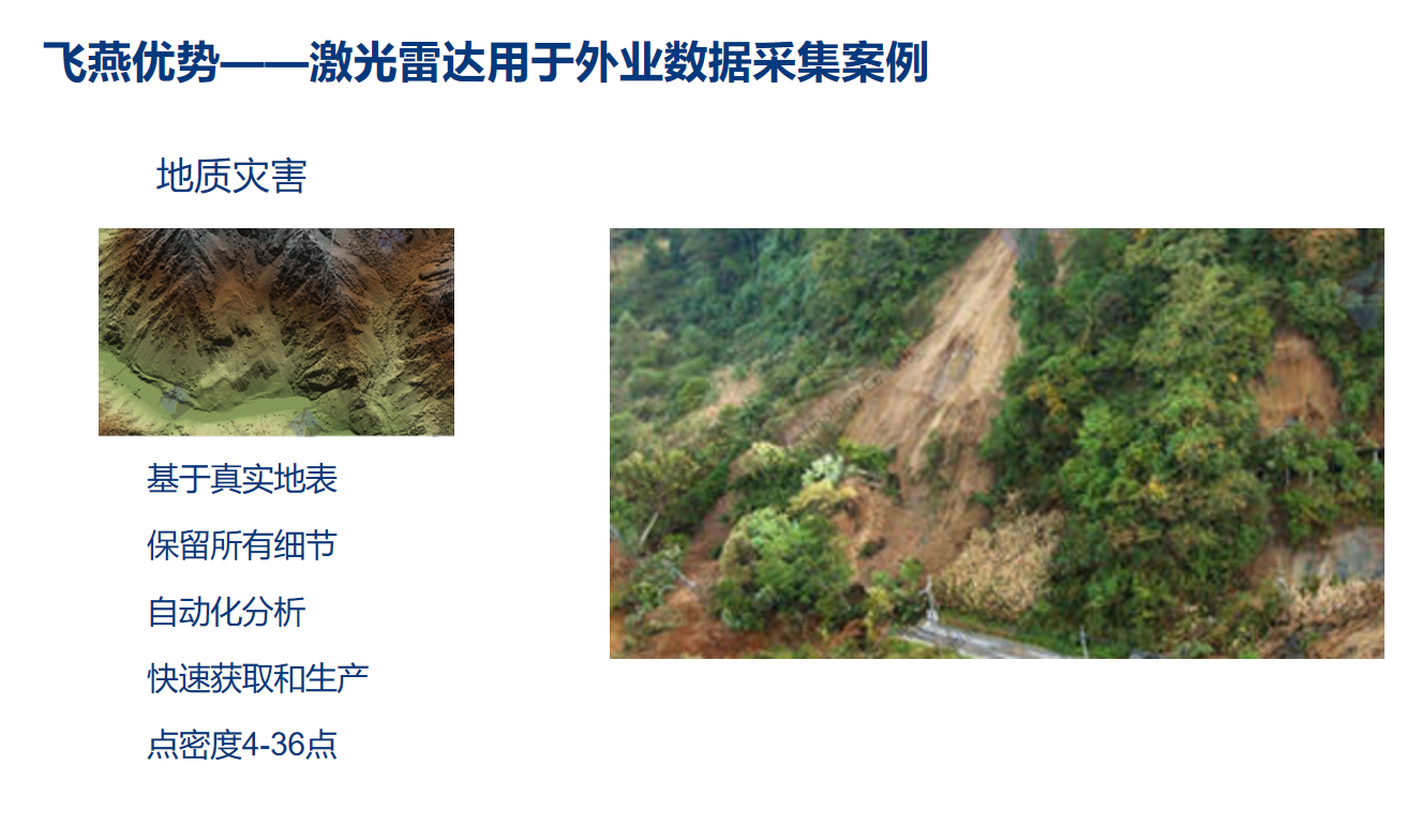 多年的深耕細作,使飛燕遙感積累出大量經(jīng)驗,以激光雷達(LiDAR)測繪技術(shù)為核心,以自然災(zāi)害監(jiān)測預(yù)警為突破口,提出一整套自然災(zāi)害應(yīng)急管理解決方案。
