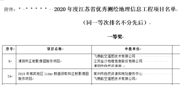 本次評選由江蘇省測繪地理信息學(xué)會組織,根據(jù)《江蘇省優(yōu)秀測繪地理信息工程評選辦法》,專家委員會對244個申報(bào)2020年度江蘇省優(yōu)秀測繪地理信息工程獎的項(xiàng)目進(jìn)行了評審。飛燕遙感完成的“溧陽市正射影像圖制作項(xiàng)目”和“2019年常武地區(qū)LiDAR數(shù)據(jù)獲取和正射影像圖制作項(xiàng)目”被評為2020年度江蘇省優(yōu)秀測繪地理信息工程一等獎。