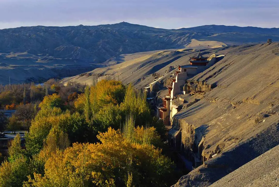 如今的莫高窟,除了正門處的地標(biāo)“九層樓”之外,最顯眼的莫過于莫高窟前茂密的胡楊林,每逢秋季,胡楊林映襯下的莫高窟都顯得格外詩意。