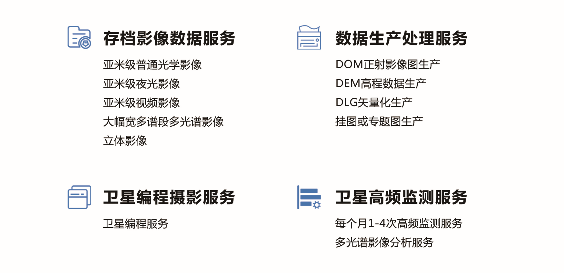 數(shù)據(jù)處理服務(wù)多樣:提供存檔影像數(shù)據(jù)服務(wù)、衛(wèi)星攝影編程服務(wù)、衛(wèi)星影像數(shù)據(jù)標(biāo)準(zhǔn)產(chǎn)品及增值產(chǎn)品生產(chǎn)服務(wù)、衛(wèi)星視頻數(shù)據(jù)標(biāo)準(zhǔn)產(chǎn)品及增值產(chǎn)品生產(chǎn)服務(wù)、衛(wèi)星影像數(shù)據(jù)4D產(chǎn)品生產(chǎn)服務(wù)、面向行業(yè)用戶的遙感解譯分析服務(wù)。